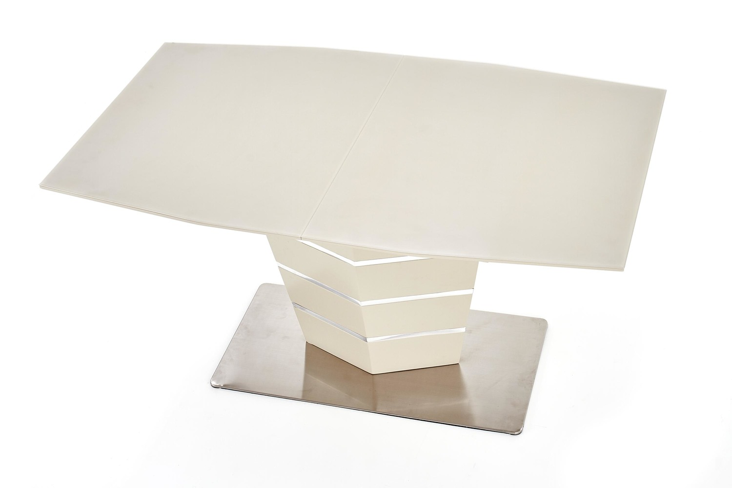 Маса Sorento е с функционален разтегателен плот, който се изработва от лакиран MDF и темперирано стъкло. Маса Sorento е с дължина на плота 140см и може да се разтегне до 180см., с разширителен плот включен в комплекта. Разтегателния плот е снабден с качествен механизъм за плавно разтягане на плота. Основата / крак се изработва от неръждаема стомана с хромирани детайли.