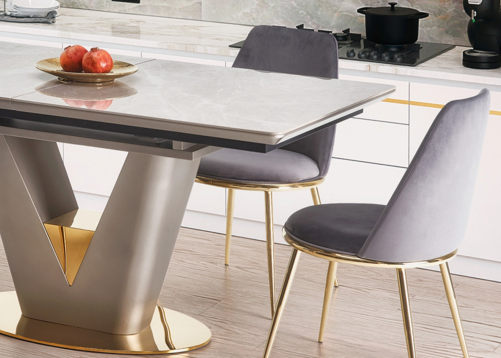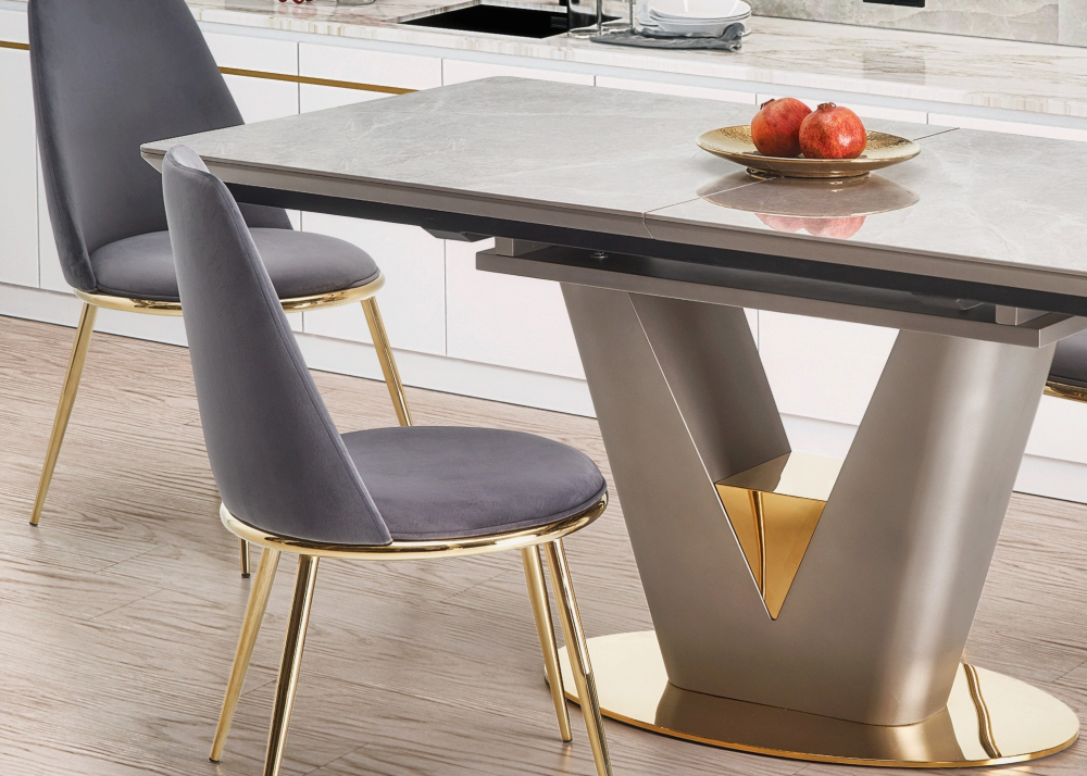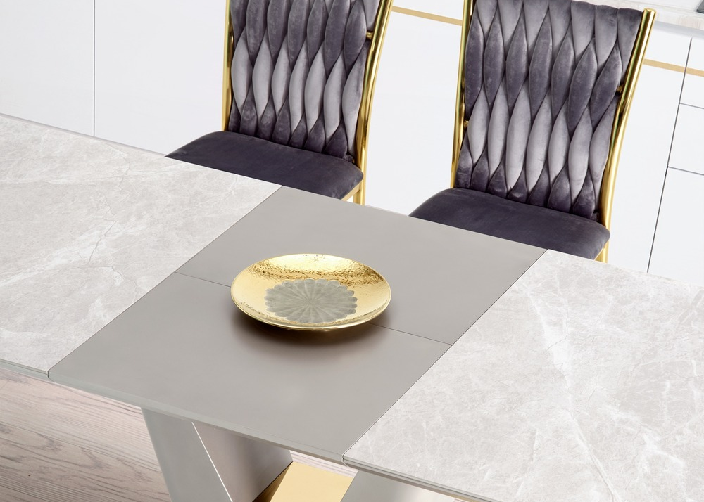 Разтегателна маса Valentino е с функционален разтегателен плот, който се изработва от керамика в цвят сив мрамор с ефекти и разширителен плот от лакиран MDF в сиво. Маса Valentino е с дължина на плота 160см и може да се разтегне до 220см, с разширителен плот включен в комплекта. Разтегателния плот е снабден с качествен синхронен механизъм за плавно разтягане на плота. Конструкцията и краката са в отличаващ се модерен дизайн, изработват се от неръждаема хромирана стомана в светло сив цвят, с хромирани и златисти акценти.