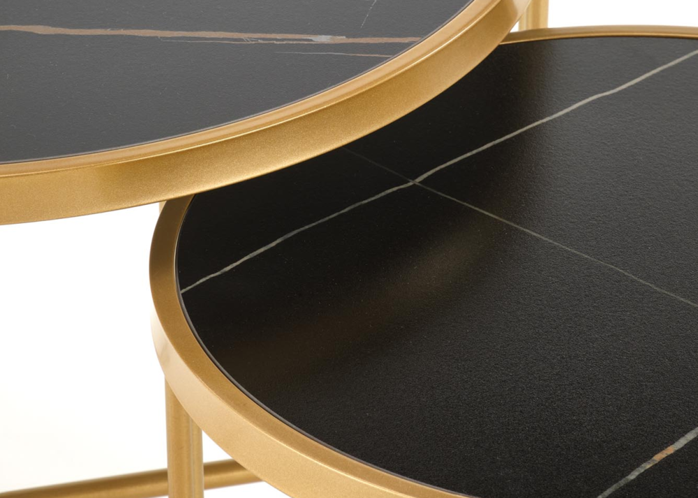Комплект холни маси Fatima с плотовете от синтерован камък в цвят черен мрамор с златисти ефекти и стоманена конструкция в златист цвят.