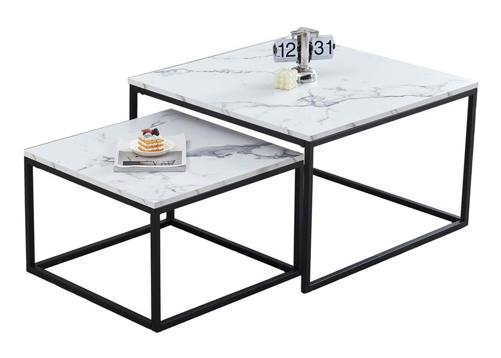 Комплект две квадратни холни маси Violeta, с красиви плотовете имитиращи Бял Мрамор с ефекти. Плотовете се изработват от ПДЧ с покритие от устойчиво фолио, а конструкцията на основата е от прахово боядисан метал в черен цвят. Комплект кафе маси Violeta са в модерен дизайн, подходящи са за съчетанието с всеки един интериор. Едната маса е по малка от другата, предлагат се само комплект.