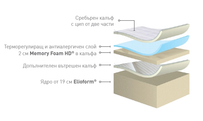 Структура на ядрото представлява един дебел слой от 19см Elioform® пяна, обвит в допълнителен предпазващ калъф от нежен и дишащ текстил. В горната част на сваляемия външен калъф, са прошити слой от Memory Foam HD® и терморегулиращ и антиалергичен слой.